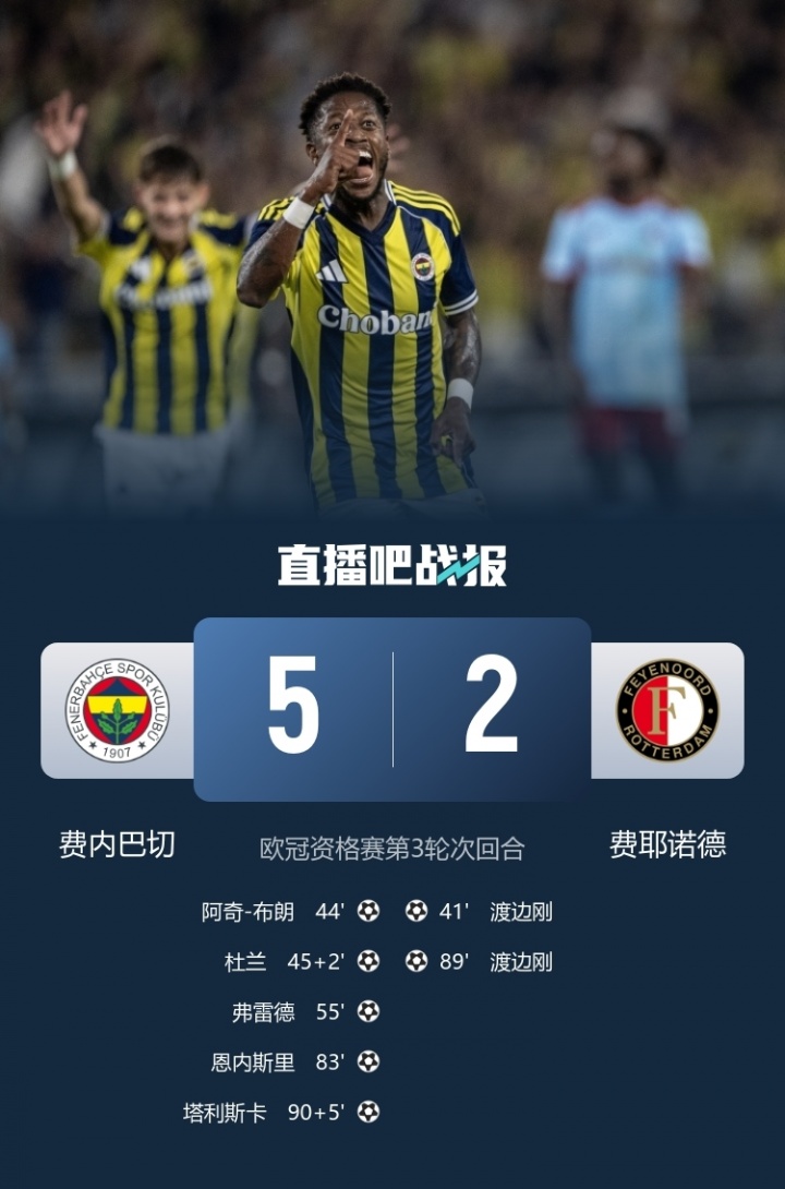 欧冠经验赛第三轮次回合,费内巴切5-2总比分6-4淘汰费耶诺德,弗雷德超等宇宙波,杜兰破门。