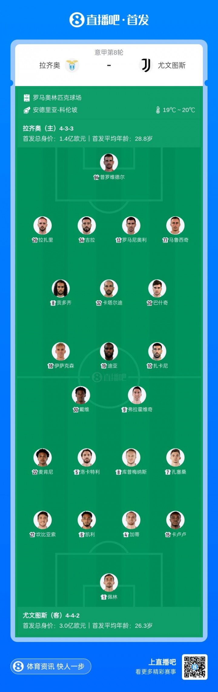 10月27日讯 意甲第8轮,拉都奥对阵尤文图斯,赛前首发公布。