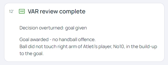 上半场马竞由阿尔瓦雷斯打进一球,主裁第一时辰判罚巴埃纳手球在先,随后切身看过VAR后阐明进球灵验。