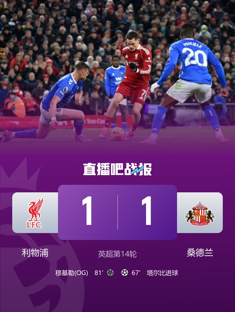英超联赛第14轮,利物浦1-1桑德兰,维尔茨造乌龙,范戴克作假。