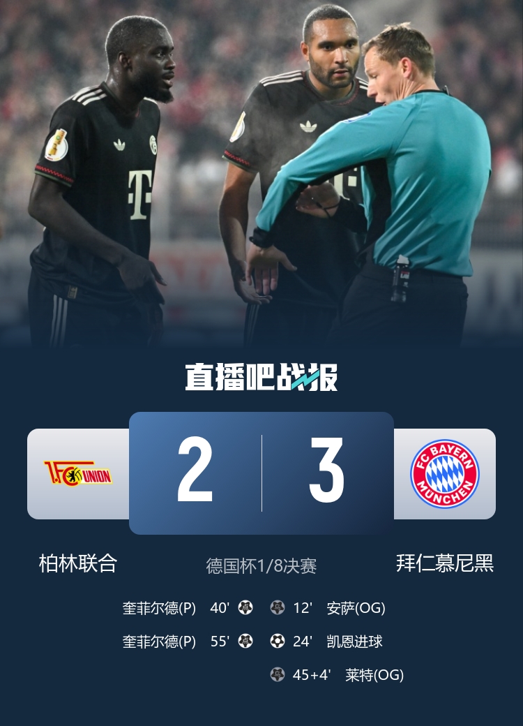 进德国杯八强!拜仁3-2柏林鸠合 凯恩破门+送点柏林鸠合两送乌龙