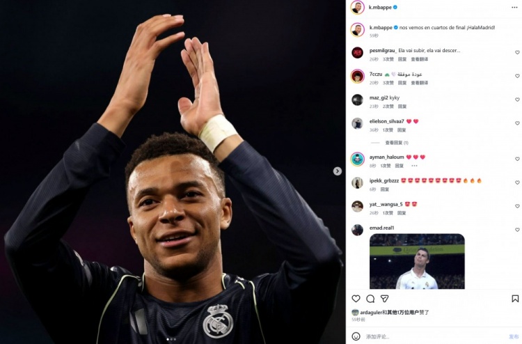 本场赛事 姆巴佩后备 登场迎来复出,赛后他也在社媒晒照庆祝获胜 ,配文写道:“我们四分之一总决赛 见!Hala Madrid!”