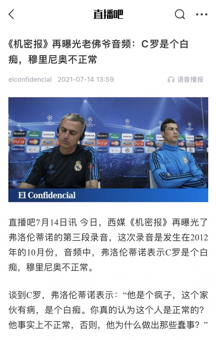 《机密报》于2021年接连曝光了多条弗洛伦蒂诺的通话录音,其中的爆炸言论包括“C罗是个疯子”、“穆里尼奥不正常”、“卡西简直是哈巴狗”、“劳尔、卡西是骗子”等等。