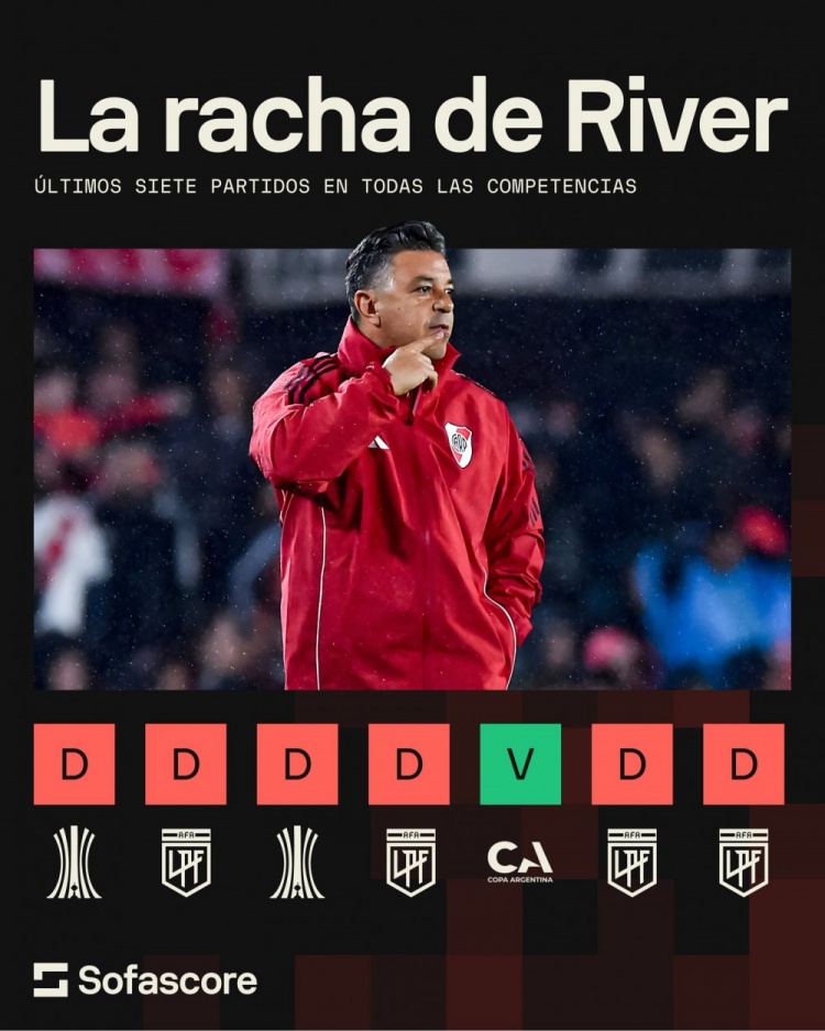 河床近7场各赛事比赛输掉6场(1胜6负),创造球队近43年最差战绩。