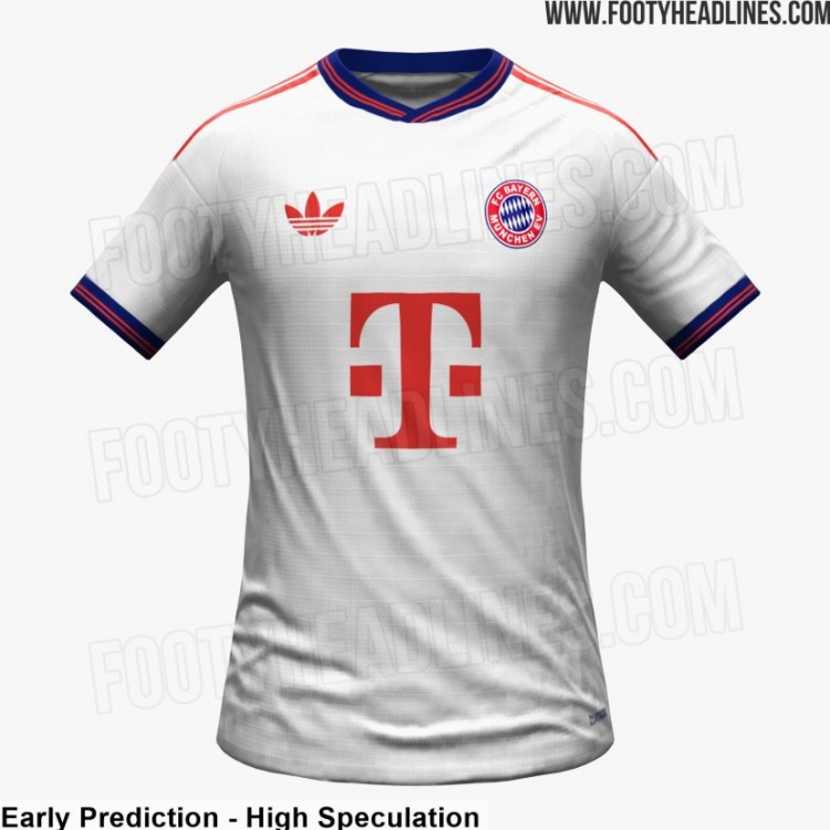 根据footyheadline泄露的信息,拜仁26/27赛季客场球衣主色调为白色,辅以肩部、领口以及袖口的红色以及海军蓝配色,胸前广告和三叶草标志也是红色。
