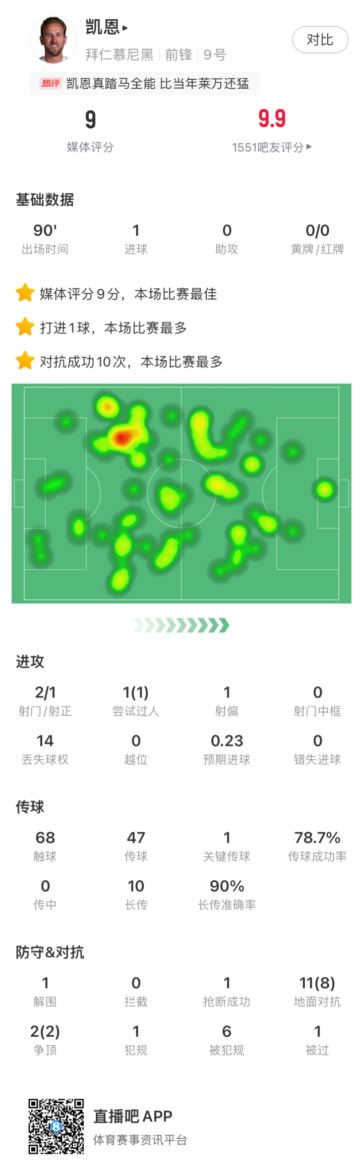德甲国家德比,凯恩的进球帮助拜仁2-1击败多特蒙德。本场凯恩不仅打入了首开记录的头球,在串联策动、对抗、防守方面也燃尽所能。