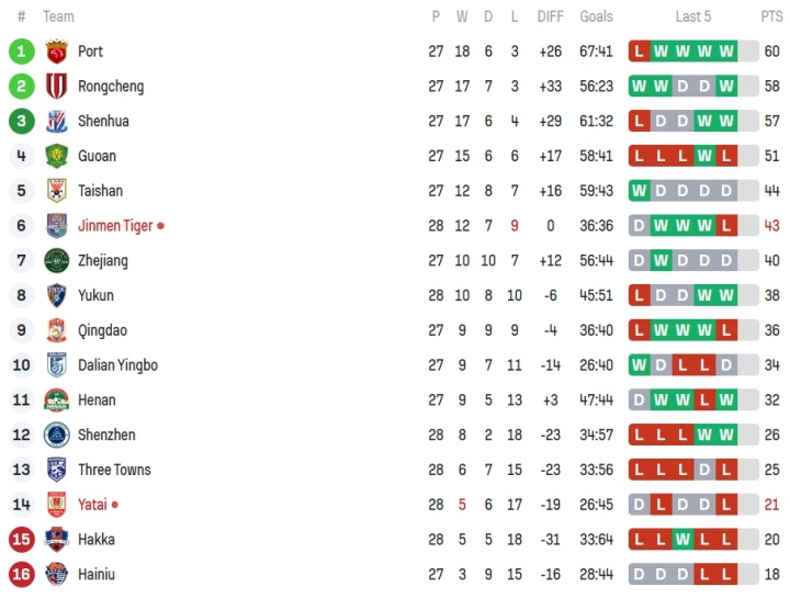 10月25日讯 中超第28轮,长春亚泰客场2-0领先天津津门虎进入半场休息,实时积分榜上,赛前垫底的亚泰以1分优势脱离降级区。