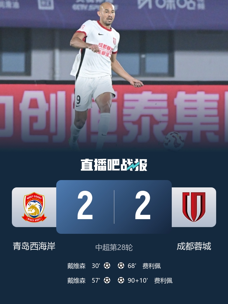 中超第二成都蓉城2-2青岛西海岸