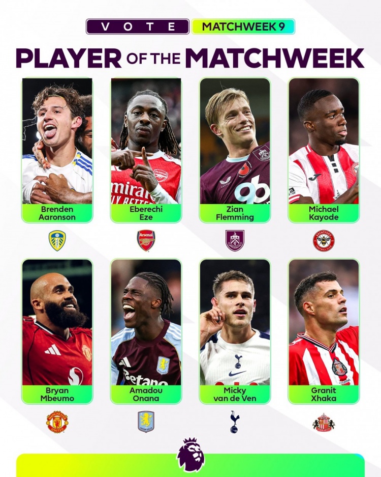 10月28日讯 英超联赛第9轮已经完赛,英超官方也列出了本轮英超最佳球员候选8人名单: