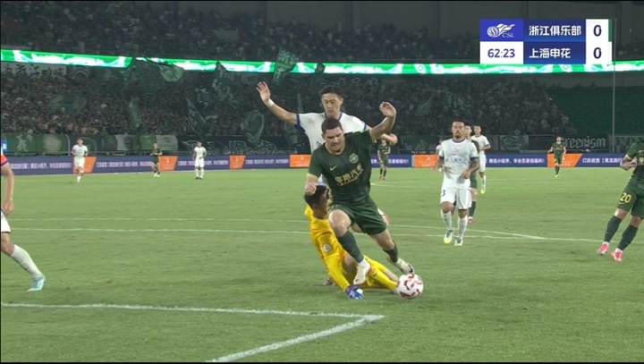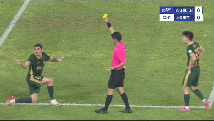 08月16日讯 中超第21轮,浙江vs上海申花,比赛第63分钟,浙江球员亚戈-卡列洛禁区倒地,裁判刚毅出示黄牌暗示球员假摔。