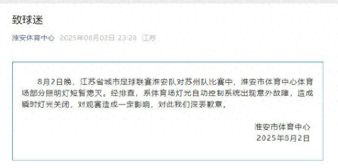 据淮安体育中心,8月2日晚,江苏省城市足球联赛淮安队对苏州队比赛中,淮安市体育中心指导场部分照明灯遽然灭火。经排查,系指导场灯光自动截至系统出现不测故障,酿成瞬时灯光关闭,对不雅赛酿成一定影响,对此咱们深表歉意。