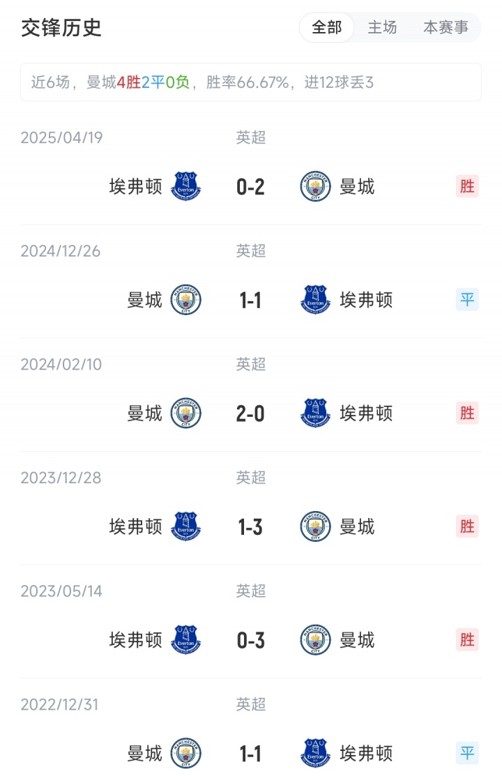 甘休赛前,曼城4胜1平2负积13分,排行英超积分榜第5;埃弗顿3胜2平2负积11分,排行英超积分榜第8。