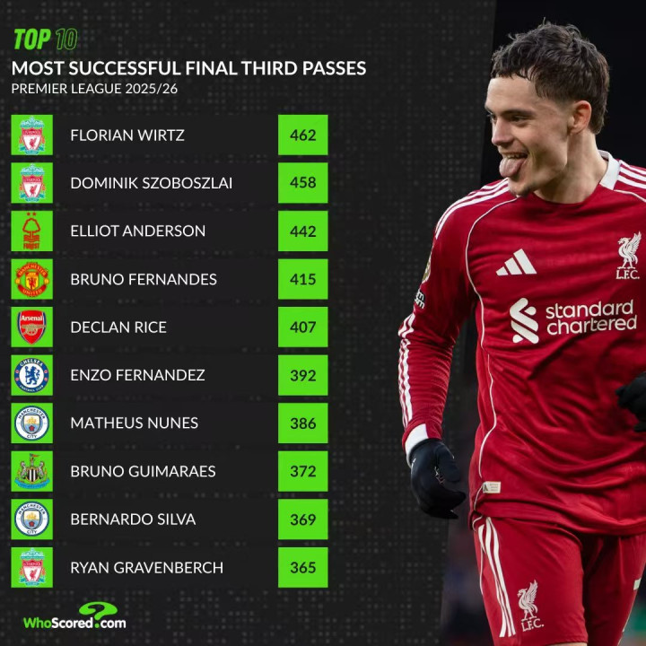 虎扑02月22日讯据数据网站WhoScored统计,在2025/26赛季英超职业联赛 中,弗洛里安-维尔茨以462次成功的攻击 三区传送球 ,高居英超榜首,成为本赛季在对方腹地最具创造力的球员。