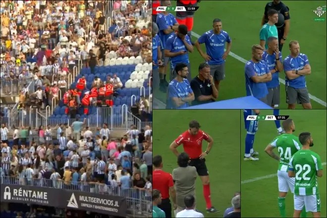 马拉加俱乐部赛后声明安抚了统统东谈主:“医疗团队已收效妥当别称在看台发生心肺骤停的中年男性球迷气象,比赛因此中断。该球迷现已规复顽强并有自主脉搏,正被转运至病院。”