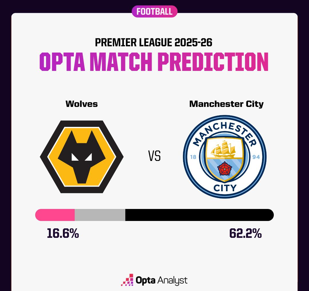 Opta关于本场的算计其实复旧的见识很明确--狼队胜,16.6%;曼城胜,62.2%;两边平局,21.2%。