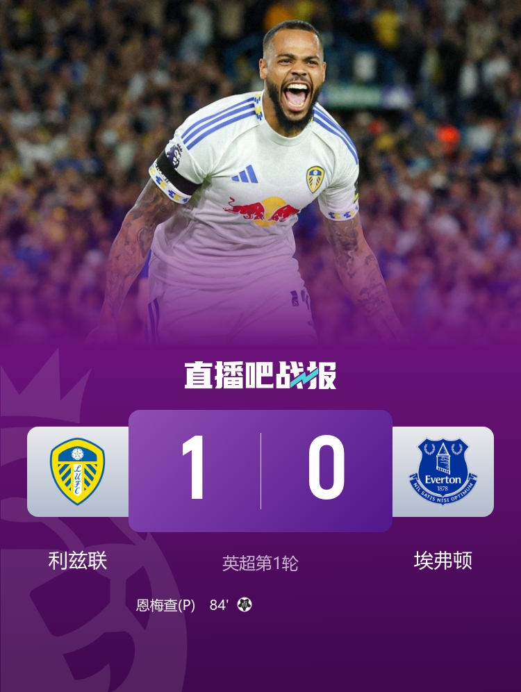 英超第1轮,利兹联在埃兰路球场1-0驯顺埃弗顿,利兹联时尚恩梅查在84分钟打进制胜点球。