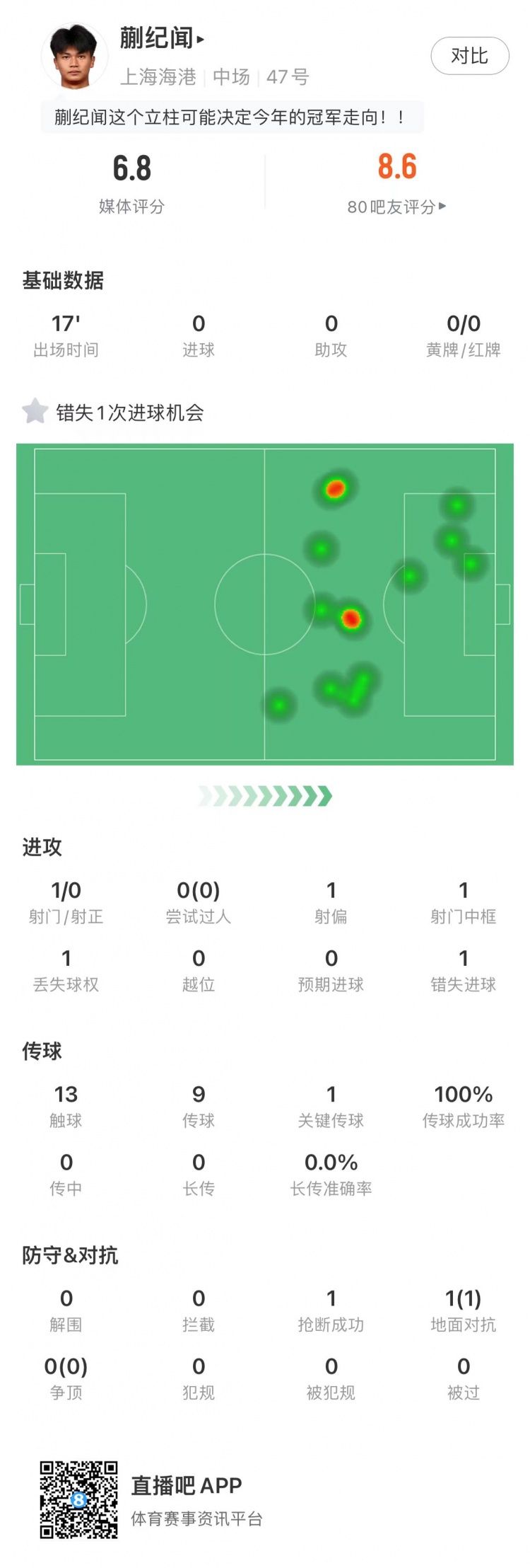 本场蒯纪闻鄙人半时替补外助梅伦多登场,出场后他显得相配活跃。在这17分钟里,蒯纪闻的传球告捷率达到了100%,比赛临了技巧,他用天确切跑位创造了一次良机,但他的射门击中了球门立柱,错失了绝杀。