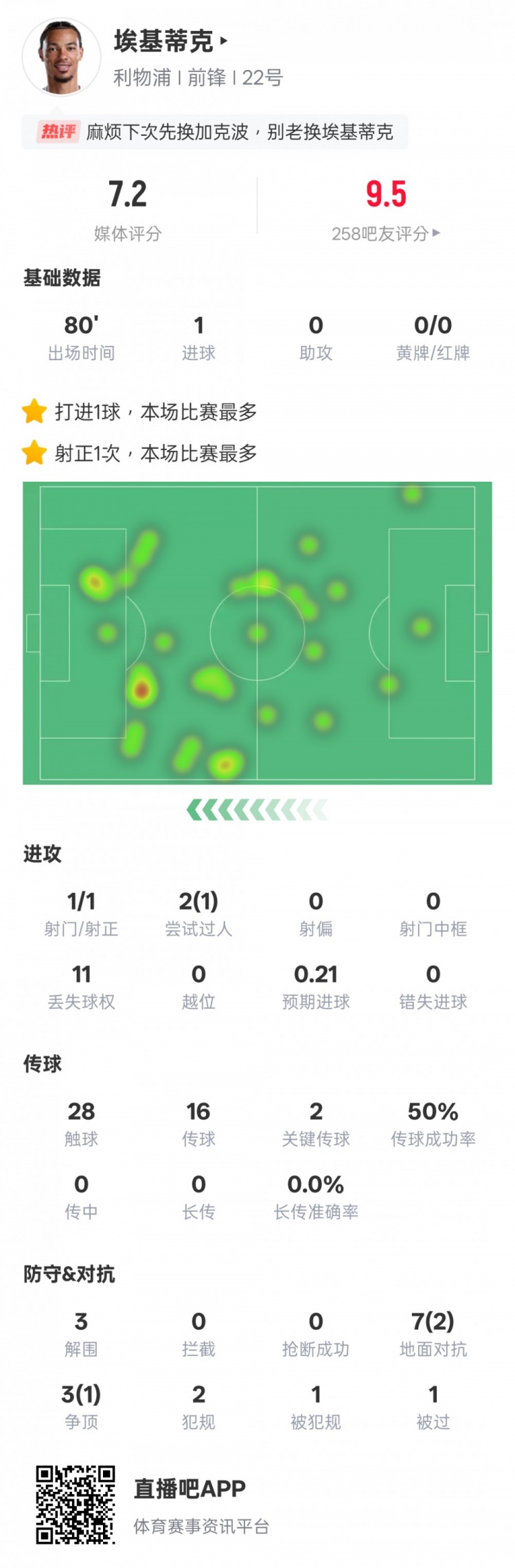 8月26日讯 2025-26赛季英超第2轮,利物浦3-2客胜纽卡。埃基蒂克首发出战,孝顺1粒进球,送出2次要津传球,还有3次突围,评分7.2。
