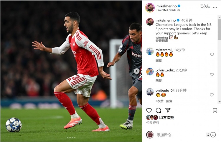 阿森纳中场梅里诺社媒晒出比赛像片,并写谈:“欧冠重回北五区,将3分留在伦敦。”