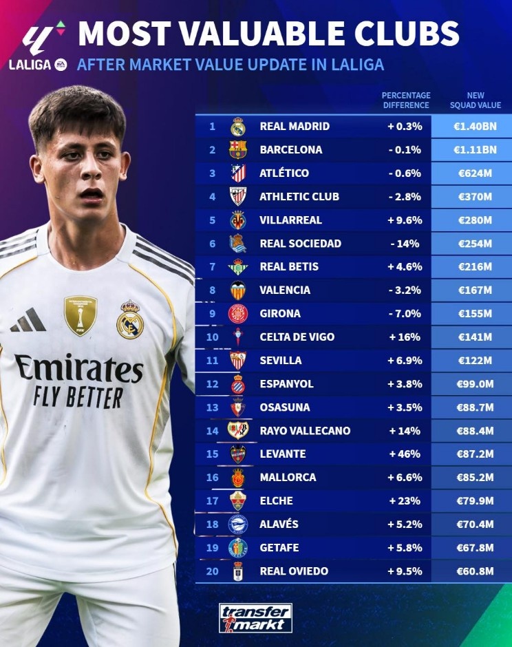 10月5日讯 德转此前更新了西甲球员身价,并盘货了当今西甲球队身价榜,具体如下: