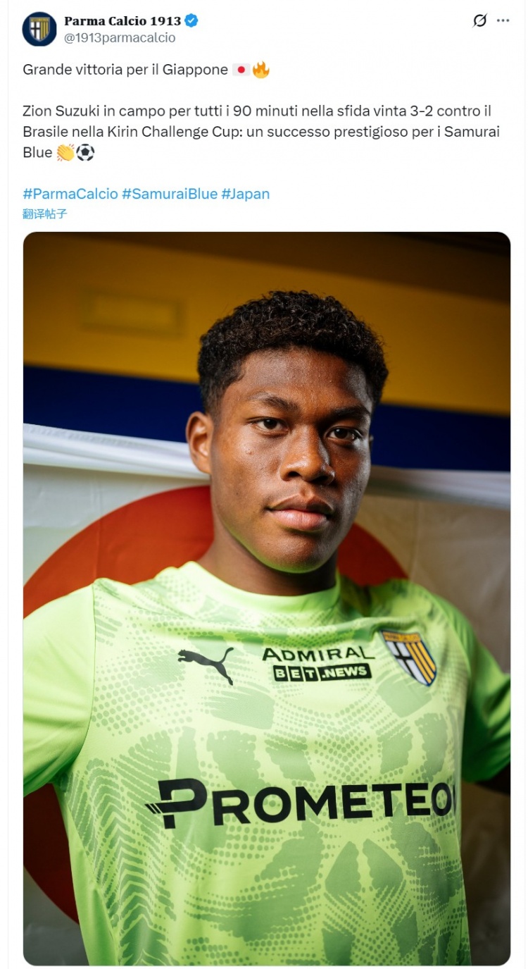 帕尔马官方社媒晒出铃木彩艳的相片,祈福自家球员随日本队取胜,配文:“日本队获得一场要紧胜仗。铃木彩艳踢满90分钟,最竟日本在麒麟杯3-2驯顺巴西,蓝武士军团斩获具有里程碑真谛的胜仗。”