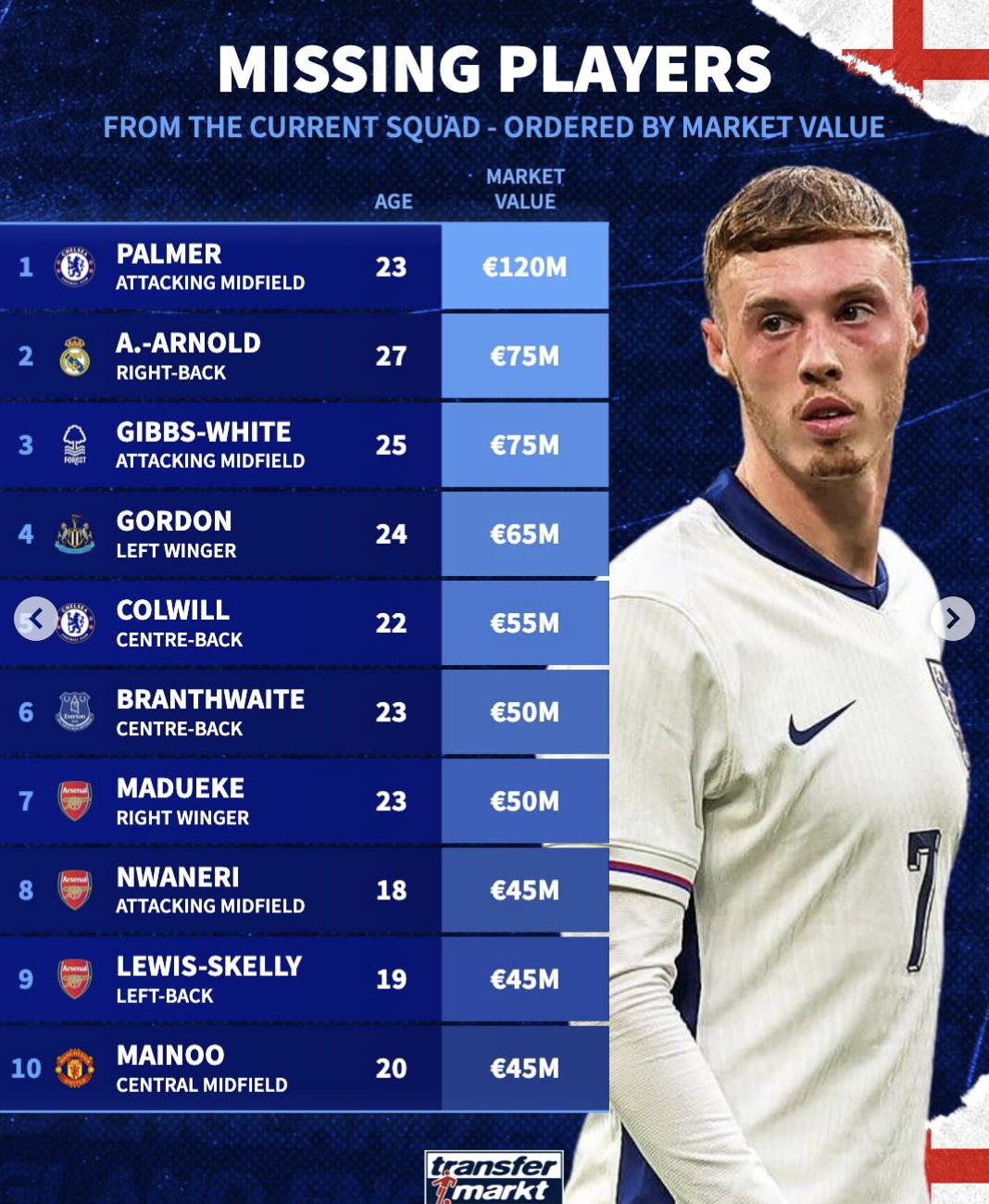 帕尔默以1.2亿欧居首,阿诺德和怀特辞别以7500万并排第二。