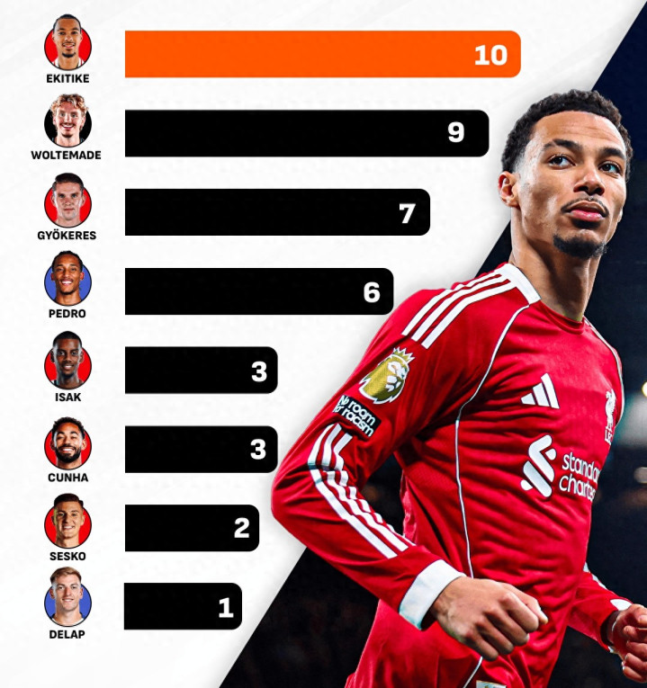 英超赛季中段遇上圣诞密集赛程,各队蹙迫线皆迎来高强度检修。泰斗数据平台LiveScore最新统计显现,本赛季英超新援先锋的进球进展差不少,利物浦新援埃基蒂克以10球独占鳌头,成了最亮眼的存在。