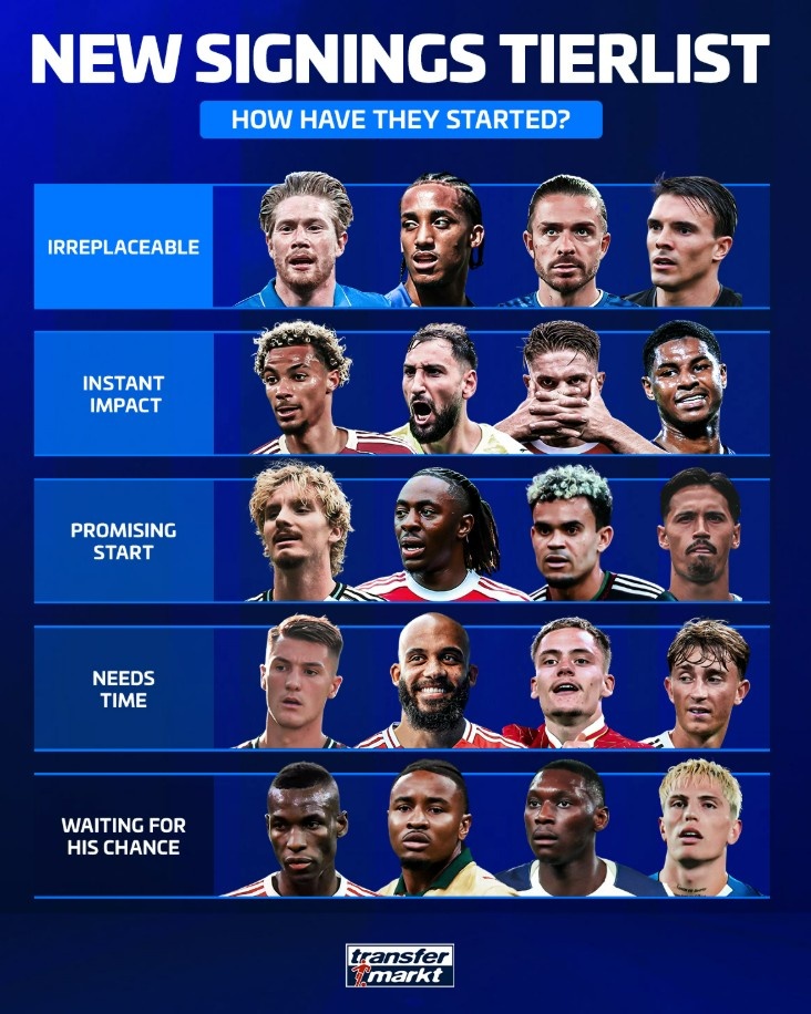 10月1日讯 德转为本赛季新援发扬作念出评级,其中德布劳内、若昂-佩德罗等最为出色,具体如下:
