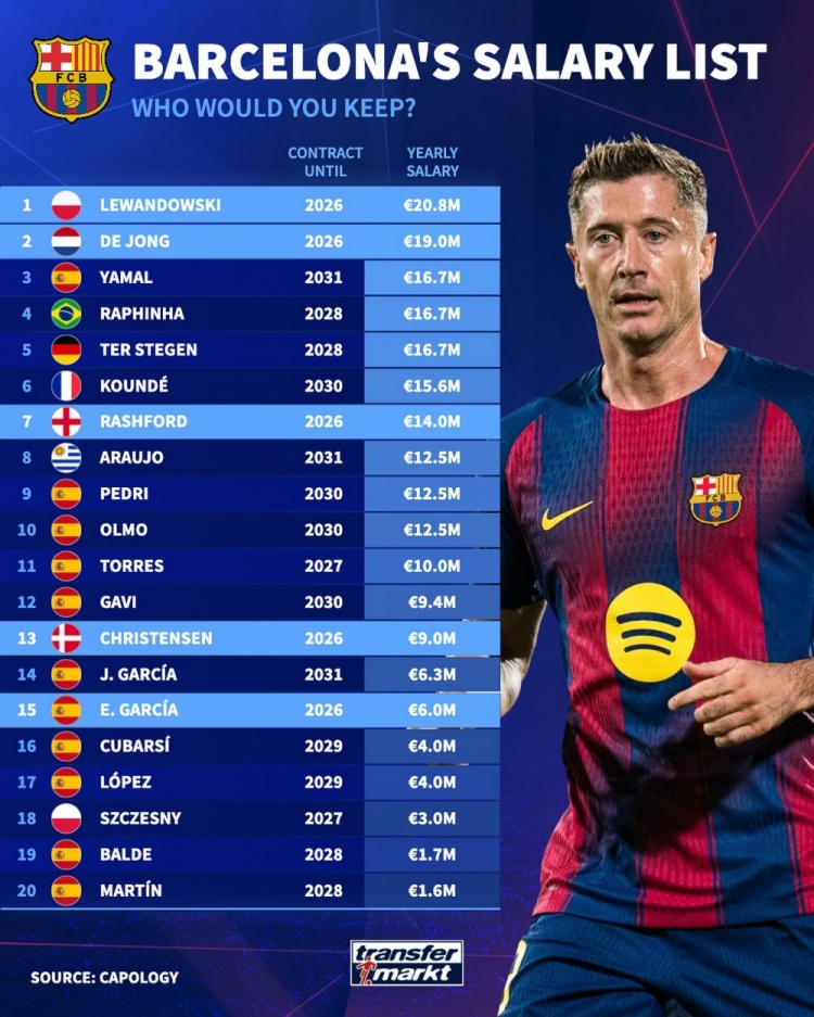 10月10日讯 德国转会阛阓列出了巴萨球员年薪排行,莱万2080万欧居首,德容1900万欧次席。