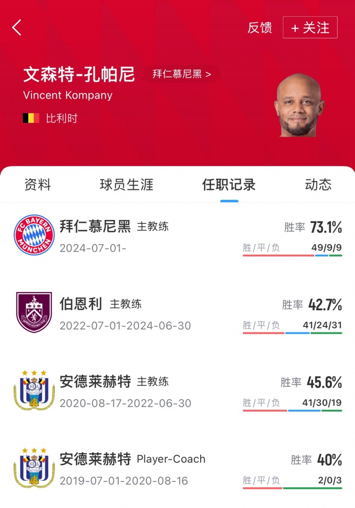 孔帕尼现年39岁,比利时籍培育,他于2024年7月成为拜仁主帅,带队67场49胜9平9负,他与拜仁的原有条约要握续到2027年,这次续约使得他在拜仁的执教生计延迟了两年。本赛季,拜仁开局获取11连胜,现在领跑德甲、欧冠积分榜。