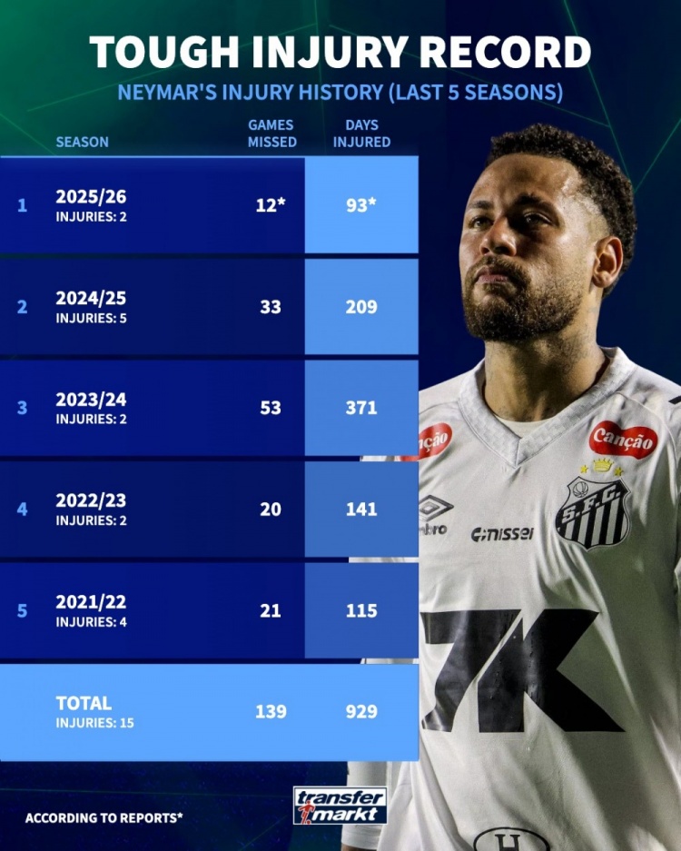 11月26日讯 德国转会市集统计了内马尔近5个赛季的伤病情况,他悉数受伤15次,伤缺929天。