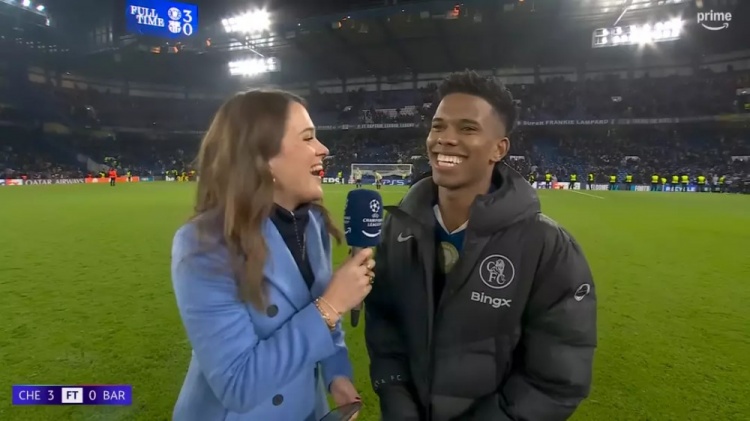 11月26日讯 欧冠联赛阶段第5轮,切尔西3-0完胜巴萨。英媒sportbible报说念,亚马逊记者亚历克斯·艾尔乔因用英葡双语对埃斯特旺进行赛后采访而走红,获赞“赛季最好采访”。
